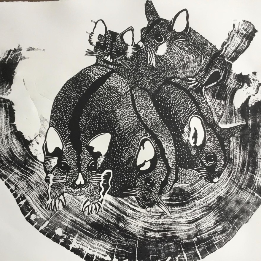 I never imagined I would be invited to exhibit my artwork in a gallery, but when MOCO gallery in Halls Gap suggested I should book an exhibition a year ahead, I thought ”Maybe I’ll be ready then”. My work with wood grain and linocut prints has developed over this time and I am pleased to be able have them on show. Hall’s Gap, in the Grampians, is the ideal location for this exhibition, as the bush environment has many examples of fallen limbs and trees, stumps and hollows in the trunks of living and dead trees. These hollows are vital habitats for many bats, birds, possums, gliders and other marsupials. Hollows take many years to form, starting when limbs fall and organisms start to break down the wood, creating a cavity in the limb or trunk. Large hollows, such as those needed by black cockatoos for nesting, can only form in trees that are over two hundred years old. Due to land clearing and habitat destruction, there are very few of these old trees left, so there is much competition for hollows.