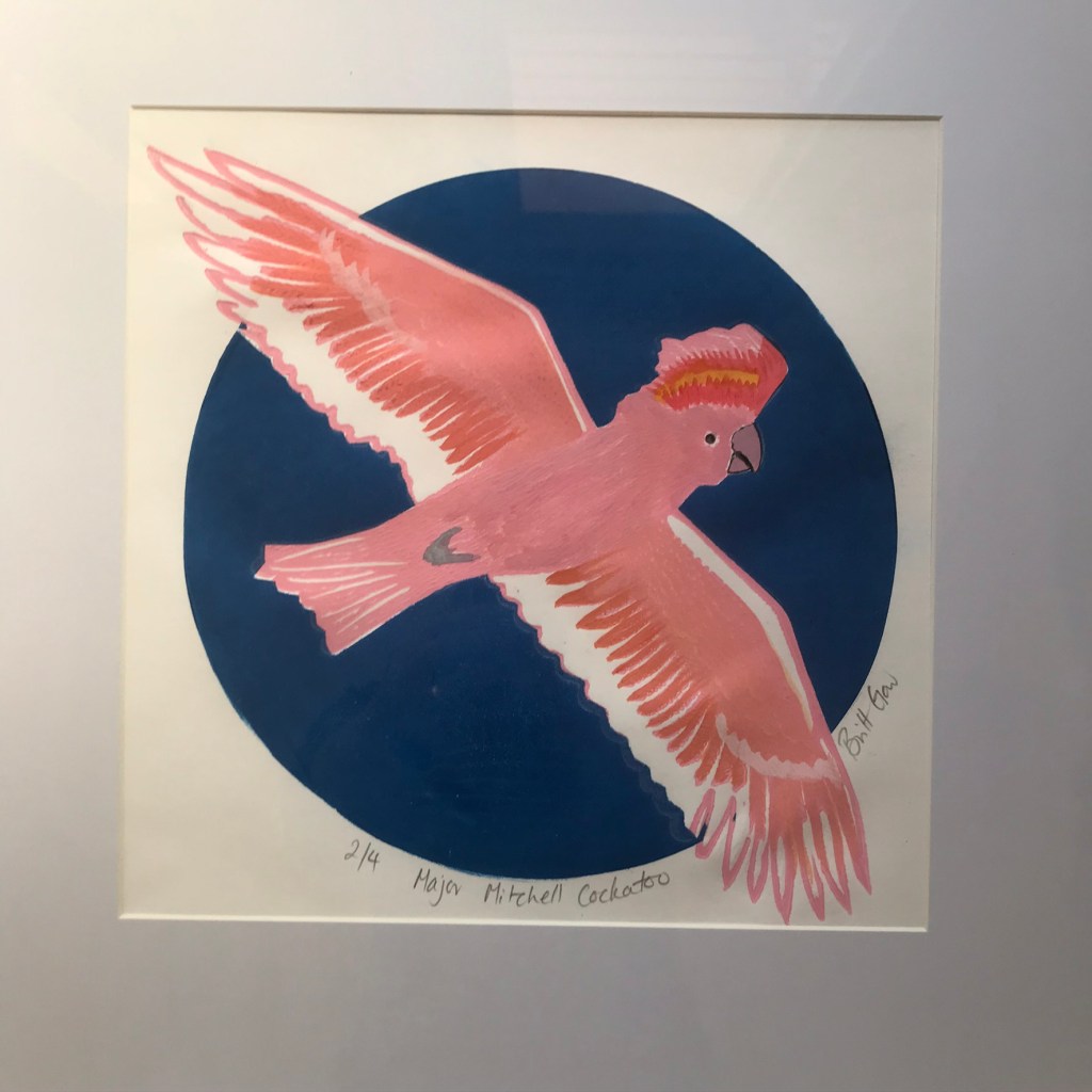 These are the newest in a series of prints featuring our fabulous native cockatoos. Same linocut block in different colour ways, some with hand painted details. Which do you like best?